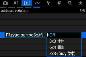 Μπορείτε να εμφανίσετε ένα πλέγμα επάνω σε στατικές εικόνες που εμφανίζονται στην προβολή μεμονωμένων εικόνων στην οθόνη προβολής/αναπαραγωγής. Αυτή η λειτουργία είναι πρακτική για τον έλεγχο της κατακόρυφης ή οριζόντιας κλίσης και της σύνθεσης της εικόνας.