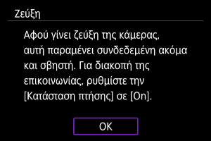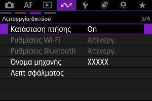 Εάν προτιμάτε να μην παραμένετε συνδεδεμένοι με τη μηχανή μέσω Wi-Fi/Bluetooth όταν είναι απενεργοποιημένη, ορίστε τη ρύθμιση [: Κατάσταση πτήσης] σε [On] ή ορίστε τη ρύθμιση [