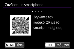 - Αν το Camera Connect δεν είναι εγκατεστημένο, χρησιμοποιήστε το smartphone για να σαρώσετε τον κωδικό QR στην οθόνη, ανοίξτε το Google Play ή το App Store για να εγκαταστήσετε το Camera Connect και, έπειτα, πατήστε