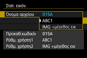 Η Ρύθμιση χρήστη 1 σάς δίνει τη δυνατότητα να καταχωρίσετε τέσσερις χαρακτήρες της επιλογής σας. Η Ρύθμιση χρήστη 2 προσθέτει τρεις αρχικούς, καταχωρισμένους χαρακτήρες της επιλογής σας σε έναν τέταρτο χαρακτήρα που αντιπροσωπεύει το μέγεθος της εικόνας που προστίθεται αυτόματα μετά τη λήψη.