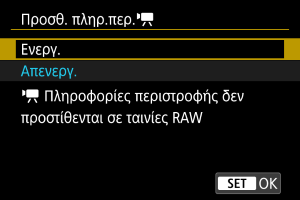 - Δεν προστίθενται πληροφορίες προσανατολισμού ταινίας, όταν η ρύθμιση [