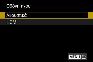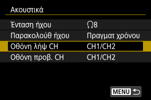 Μπορείτε να επιλέξετε τον συνδυασμό καναλιών για έξοδο από την υποδοχή ακουστικών κατά τη λήψη ή την προβολή/αναπαραγωγή. Αυτή η ρύθμιση ισχύει επίσης για την έξοδο του ηχείου ().