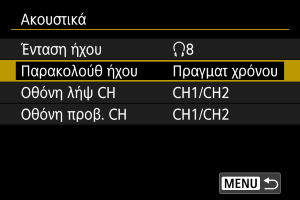 Κατά την εγγραφή ταινίας μπορείτε να επιλέξετε τον ήχο που χρησιμοποιείται για την έξοδο των ακουστικών. Για να μειώσετε τον θόρυβο στην εγγραφή ήχου, διαμορφώστε την επιλογή [Μείωση θορύβ ήχου] ().