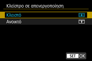 Μπορείτε να ρυθμίσετε αν θα αφήσετε το κλείστρο ανοικτό ή θα το κλείσετε όταν ο διακόπτης λειτουργίας της μηχανής είναι ρυθμισμένος στη θέση Απενεργοποίηση.
