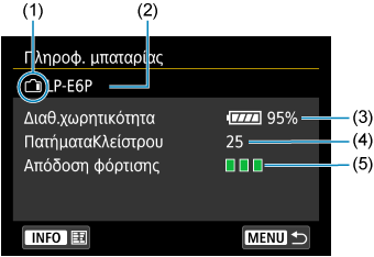 - (4) Ο αριθμός των λήψεων που έγιναν με την τρέχουσα μπαταρία. Ο αριθμός μηδενίζεται όταν φορτίζεται η μπαταρία.