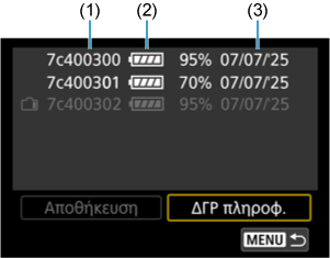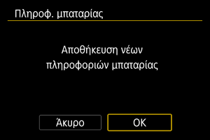 Μπορείτε να καταχωρίσετε έως και έξι συστοιχίες μπαταριών LP-E6P στη μηχανή. Για να καταχωρίσετε πολλές μπαταρίες στη μηχανή, ακολουθήστε την παρακάτω διαδικασία για κάθε μπαταρία.