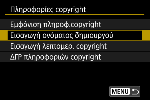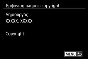 Αν επιλέξετε [Εμφάνιση πληροφ.copyright] στο βήμα 2, μπορείτε να ελέγξετε τις πληροφορίες [Δημιουργός] και [Copyright] που εισαγάγατε.