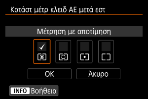 Για κάθε κατάσταση φωτομέτρησης, μπορείτε να καθορίσετε εάν θα κλειδώνεται η έκθεση (Κλείδωμα AE) μόλις τα θέματα εστιάζονται με την κατάσταση One-Shot AF. Η έκθεση θα κλειδώνεται για όσο χρόνο κρατάτε πατημένο το κουμπί κλείστρου μέχρι το μέσον της διαδρομής του. Επιλέξτε καταστάσεις φωτομέτρησης για το κλείδωμα AE και προσθέστε σημάδι ελέγχου []. Επιλέξτε [ΟΚ] για να αποθηκεύσετε τη ρύθμιση.