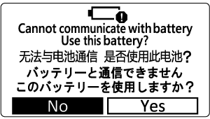 Aparece [Cannot communicate with battery Use this battery?] (No se puede comunicar con la batería ¿Usar esta batería?).