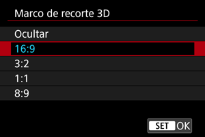 Si va a recortar vídeos grabados con RF-S7.8mm F4 STM DUAL, puede mostrar un marco de recorte 3D en la pantalla de grabación de vídeo (durante la espera y la grabación) para tener en cuenta el ángulo de visión final después de editar.