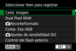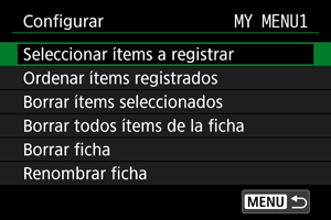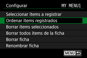 Puede cambiar el orden de los elementos registrados en Mi menú. Seleccione [Ordenar ítems registrados], seleccione un elemento para reorganizarlo y, a continuación, presione