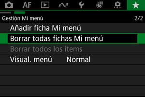 Puede borrar todas las fichas Mi menú que haya creado. Cuando seleccione [Borrar todas fichas Mi menú], todas las fichas de [MY MENU1] a [MY MENU5] se eliminarán y la ficha [] recuperará su estado predeterminado.