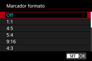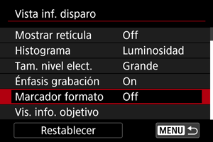 Si va a cambiar el formato de la imagen al editar el vídeo grabado, puede mostrar los marcadores de formato en la pantalla de grabación de vídeo (durante la espera y la grabación) para tener en cuenta el ángulo de visión final después de editar.