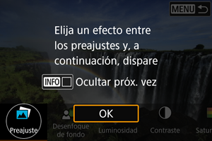 Para guardar el ajuste actual en la cámara, toque [Registrar] en la pantalla de ajuste [Ayuda creativa] y, a continuación, seleccione [OK]. Se puede guardar hasta tres preajustes como [USER*]. Una vez que se han guardado tres, para guardar otro nuevo, se debe sobrescribir un preajuste [USER*] existente.