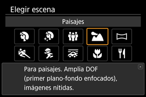 Utilice [] (Paisajes) para grandes paisajes, para que todo quede enfocado, de lo más cercano a lo más lejano. Para obtener imágenes nítidas y definidas con azules y verdes vivos.