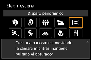 Utilice [] (Disparo panorámico) para fotografiar panorámicas. La panorámica se crea combinando disparos captados en disparos en serie mientras mueve la cámara en una dirección y presiona el obturador completamente.