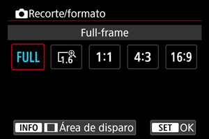 Cuando utilice un objetivo RF o EF, puede cambiar el formato antes del disparo. Puede utilizar [1,6× (recorte)] para la toma como si utilizara un teleobjetivo, ya que esta opción amplía el centro de la imagen (un área equivalente al tamaño APS-C).