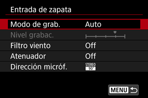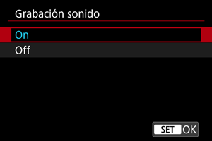 Seleccione [On] para grabar sonido durante la grabación de vídeo. Para la grabación se utiliza el micrófono integrado, a menos que utilice micrófonos externos o diseñados para la zapata multifunción.