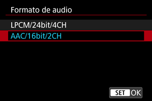 Puede elegir el formato de audio que se usará para el sonido en la grabación de vídeo.