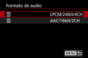 - La selección de [LPCM/24bit/4CH] activa la grabación de sonido de cuatro canales. La selección de [AAC/16bit/2CH] restringe la grabación a dos canales (con un solo micrófono).