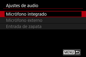 Configure micrófonos para la grabación de sonido en estos ajustes. Cuando utilice micrófonos externos o diseñados para una zapata multifunción, consulte también el manual de instrucciones del micrófono.