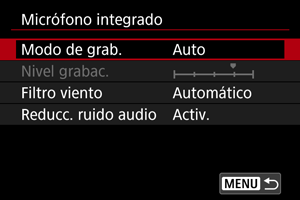 - Para reducir el ruido, durante un periodo breve no se graba ningún sonido mientras los ajustes de [Modo de grab.], [Filtro viento] o [Atenuador] se cambian.