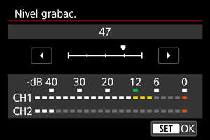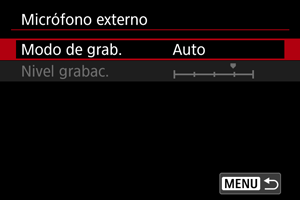Puede ajustar el nivel de grabación de sonido como necesite. Ajuste el nivel en [Nivel grabac.].