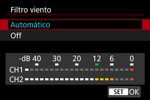 Ajuste en [Automático] (o en [On]) para reducir la distorsión del audio en escenas en exterior con viento. Cuando tiene efecto la función de filtro de viento, también se reducen parte de los sonidos de baja frecuencia.