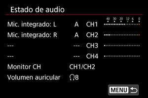 - [Monitor CH] indica los canales establecidos en [Monitor disp. CH] para [Auriculares] en [