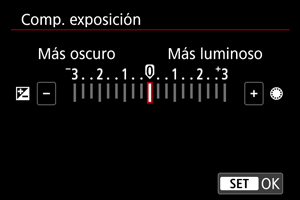 Puede ajustar la compensación de la exposición hacia el lado positivo o negativo para aclarar u oscurecer imágenes en relación con la exposición estándar determinada por la cámara.
