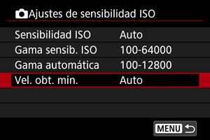Para evitar que se ajusten automáticamente velocidades de obturación demasiado bajas, puede ajustar la velocidad de obturación mínima para ISO Auto.