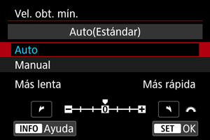 - Cuando se ajuste [Auto (Estándar)], la velocidad de obturación mínima será la recíproca de la longitud focal del objetivo. Un solo paso de [Más lenta] a [Más rápida] equivale a un solo punto de velocidad de obturación.