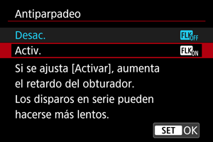 - Cuando se ajuste [Activ.] y se dispare bajo una fuente de luz parpadeante, es posible que el retardo del tiempo de disparo se haga más largo.