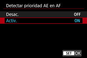 - [Activ.]: la medición se basa en el punto AF o el área AF donde se detectó el motivo.
