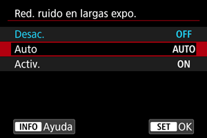 Para las imágenes expuestas durante 1 seg. o más, la reducción de ruido se realiza automáticamente si se detecta ruido típico de las largas exposiciones. Este ajuste es suficientemente eficaz en la mayoría de los casos.