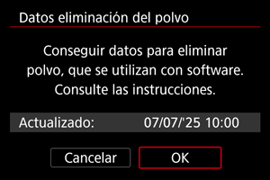 A partir de ahora, la cámara anexará los datos de eliminación del polvo adquiridos a todas las fotografías. Se recomienda adquirir datos de eliminación del polvo antes de disparar.