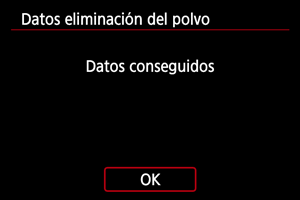 - Cuando se tome la fotografía, la cámara iniciará la recogida de datos de eliminación del polvo. Cuando se obtengan los datos de eliminación del polvo, aparecerá un mensaje.