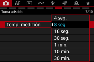 Puede ajustar cuánto tiempo funciona el temporizador de medición (que determina la duración de la visualización del valor de exposición/bloqueo AE) una vez activado por una acción como presionar el disparador hasta la mitad.