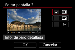 Puede personalizar los detalles y las pantallas de información que se muestran en la pantalla o en el visor al disparar.