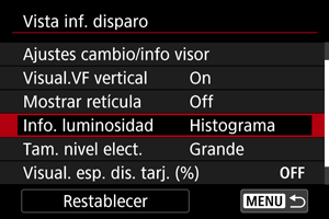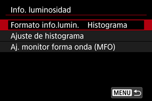 Puede establecer el formato de la información sobre luminosidad (histograma o monitor de forma de onda) disponible cuando se presiona el botón durante el estado de espera de disparo.