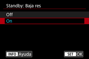 Ajuste en [On] para ahorrar energía de la batería y controlar el aumento de temperatura de la cámara durante la espera.