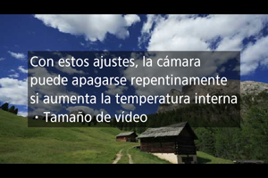 Las orientaciones advierten de que la cámara podría calentarse internamente si se graban vídeos con los ajustes actuales, y de que la cámara podría apagarse automáticamente si sigue grabando.