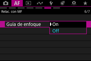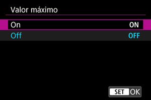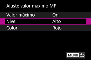 - El valor máximo de MF puede ser difícil de discernir con sensibilidades ISO altas, especialmente cuando se ajusta la ampliación ISO. Si es necesario, baje la sensibilidad ISO o ajuste [Valor máximo] en [Off].