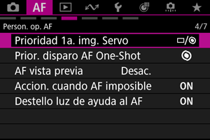 Puede ajustar las características de la operación AF y el momento del disparo del obturador para el primer disparo con AF Servo.