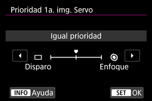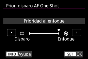 Puede especificar si dar prioridad al enfoque o al momento del disparo para AF foto a foto (excepto cuando se dispare con el disparador táctil).