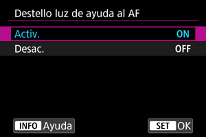 Desactiva el disparo de la luz de ayuda al AF. Ajústelo si prefiere no disparar la luz de ayuda al AF.