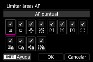 Puede limitar las áreas AF disponibles a las áreas que utiliza normalmente. Seleccione las áreas AF disponibles y presione para añadir una marca de verificación [
