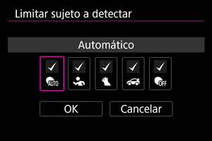 Puede limitar las opciones de ajuste disponibles en [: Sujeto a detectar] según sus opciones preferidas. Seleccione una opción para excluir y presione