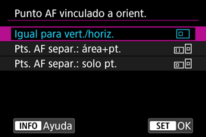 Puede establecer tipos de áreas AF o posiciones de puntos AF separados para tomas verticales y horizontales.