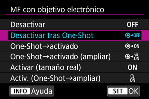 : MF con objetivo electrónico] se ajusta en [Activar (tamaño real)] o [Activ. (One-Shot→ampliar)].
